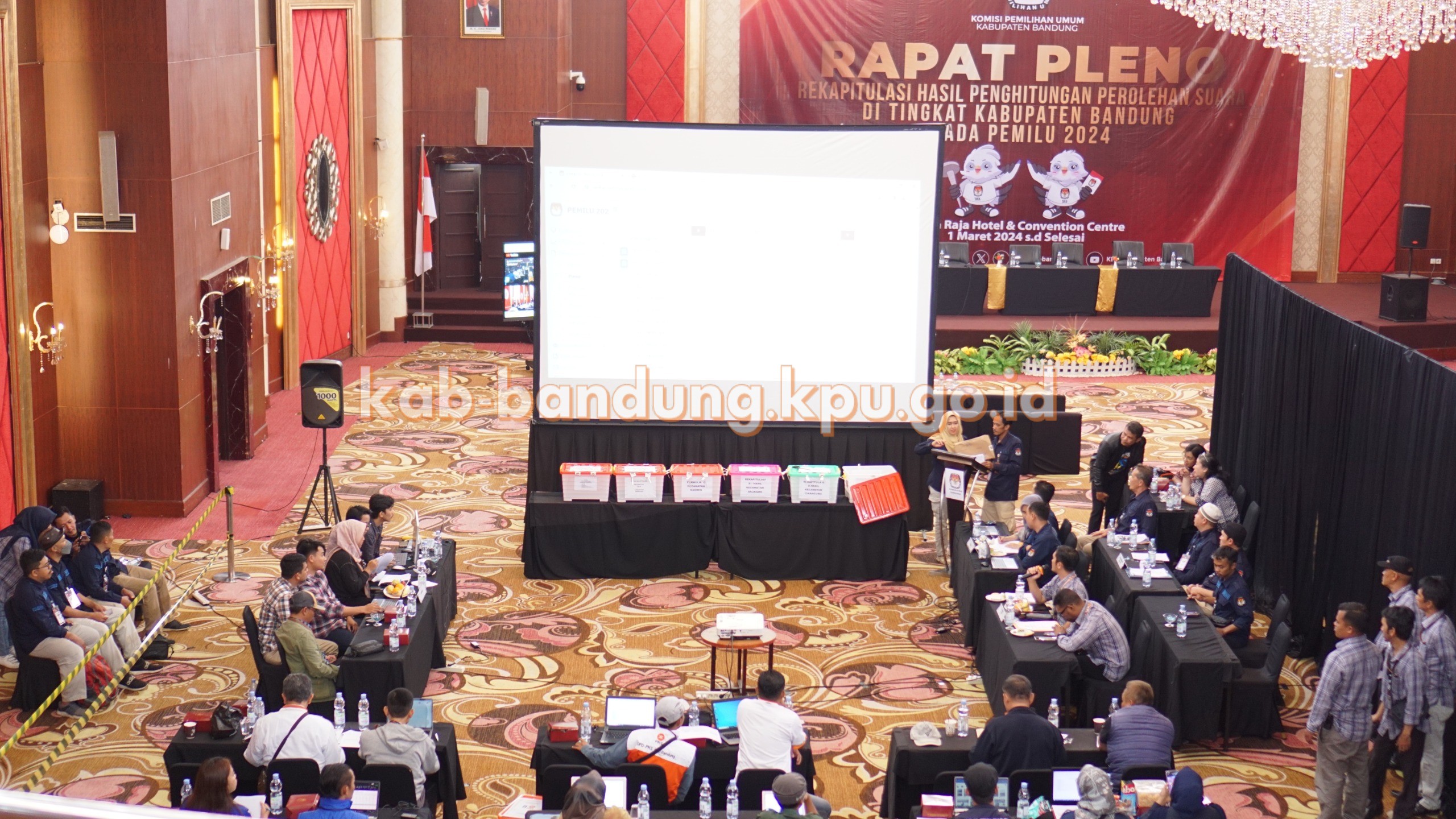 Sesuai jadwal yang telah ditentukan, KPU Kabupaten Bandung membacakan Rekapitulasi Hasil Penghitungan Perolehan Suara Pemilu 2024 tingkat Kabupaten Bandung untuk Pemilihan Presiden dan wakil Presiden, DPR RI, DPD, DPRD Provinsi Jawa Barat dalam Rapat Pleno Terbuka Rekapitulasi Hasil Pemungutan Perolehan Suara dan Penetapan Hasil Pemilu Serentak Tahun 2024 di Tingkat Provinsi Jawa Barat. Pembacaan dilakukan secara bergiliran oleh Ketua dan Anggota KPU Kabupaten Bandung. Turut hadir dalam Rapat Pleno terbuka, Bawaslu Kabupaten Bandung juga para saksi. Bertempat di Aula Setia Permana KPU Provinsi Jawa Barat pada tanggal 9 Maret hingga 10 Maret 2024. (Humas KPU Kabupaten Bandung).