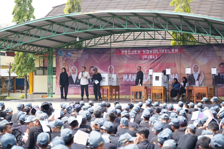 BANDUNG, KPU Kabupaten Bandung menggelar kegiatan simulasi pemungutan suara kepada 1.700 siswa/siswi di SMKN 1 Katapang, Rabu (17/09). Hadir Ketua KPU Kabupaten Bandung Syam Zamiat Nursyamsi bersama dengan Sekretaris KPU Kabupaten Bandung Enda Kurniawan menyampaikan materi terkait demokrasi. Nilai-nilai demokrasi yang diajarkan melalui pemilihan akan menjadi bekal penting bagi siswa dalam kehidupan bermasyarakat di masa depan.