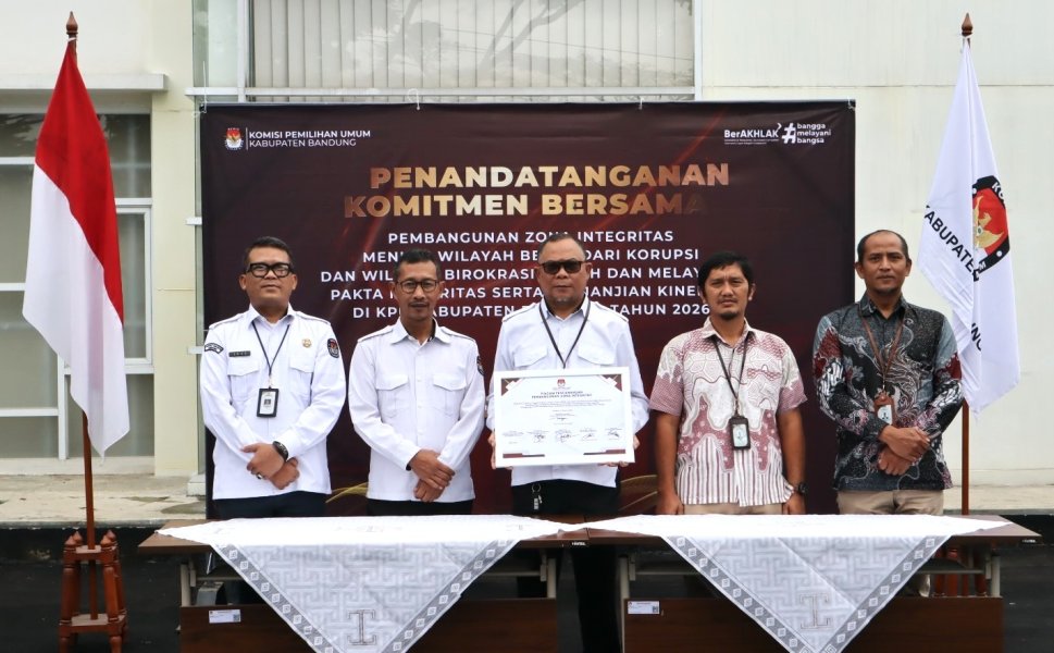 Bandung - Sebagai wujud komitmen bersama dalam mewujudkan birokrasi yang bersih, transparan, dan akuntabel, seluruh pegawai di Lingkungan KPU Kabupaten Bandung menandatangani Pakta Integritas dalam rangka pembangunan Zona Integritas Menuju Wilayah Bebas Korupsi (WBK) dan Wilayah Birokrasi Bersih dan Melayani (WBBM) pada Senin (12/1/2026). Pada kegiatan ini seluruh pegawai yang terdiri dari Ketua, Anggota, Sekretaris, Para Kasubbag, Pejabat Fungsional dan seluruh Staf menandatangani Pakta Integritas yang berisi 7 poin terkait peran dalam upaya pencegahan dan pemberantasan korupsi, kolusi dan nepotisme .