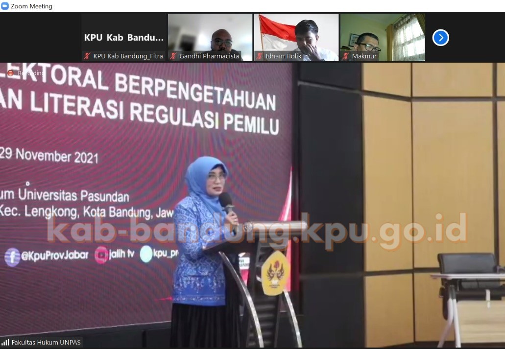 Bandung, kab-bandung.kpu.go.id – KPU Provinsi Jawa Barat berkolabolasi dengan Fakultas Hukum Universitas Pasundan Bandung mengadakan webinar dengan tema Aktivasi Partisipasi Elektoral Berpengetahuan Mahasiswa: Pendekatan Literasi Regulasi Pemilu, dalam rangka memberikan pendidikan hukum terkait dengan kepemiluan. Keterlibatan mahasiswa menjadi sangat penting karena ditahun 2030 ke depan, Indonesia akan mengalami bonus demografi dimana jumlah penduduk dengan rata-rata usia produktif lebih banyak pada kondisi tersebut. Oleh karenanya, kondisi demikian perlu menjadi perhatian dalam rangka keterlibatan usia produktif dalam pemilu terkait dengan pemilih pemula, dalam hal ini adalah mahasiswa. Webinar diselenggarakan secara daring dan luring yang dihadiri oleh dosen pengajar serta para mahasiswa.