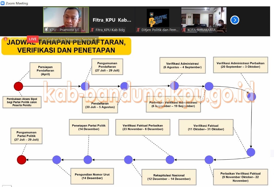 Bandung, kab-bandung.kpu.go.id – KPU Kabupaten Bandung mengikuti Sosialisasi Rancangan Peraturan Komisi Pemilihan Umum (PKPU) Pendaftaran, Verifikasi dan Penetapan Partai Politik Peserta Pemilu yang diselenggarakan oleh Direktorat Jenderal Politik dan Pemerintahan Kementrian Dalam Negeri (Ditjen Polpum Kemendagri) secara daring dalam rangka menghadapi persiapan Pemilu 2024 pada Rabu (23/3/2022). Pramono Ubaid Tanthowi, Komisioner KPU RI Periode 2017-2022 serta Anggota Bawaslu RI Rahmat Bagja, menjadi narasumber pada kegiatan sosialisasi ini.