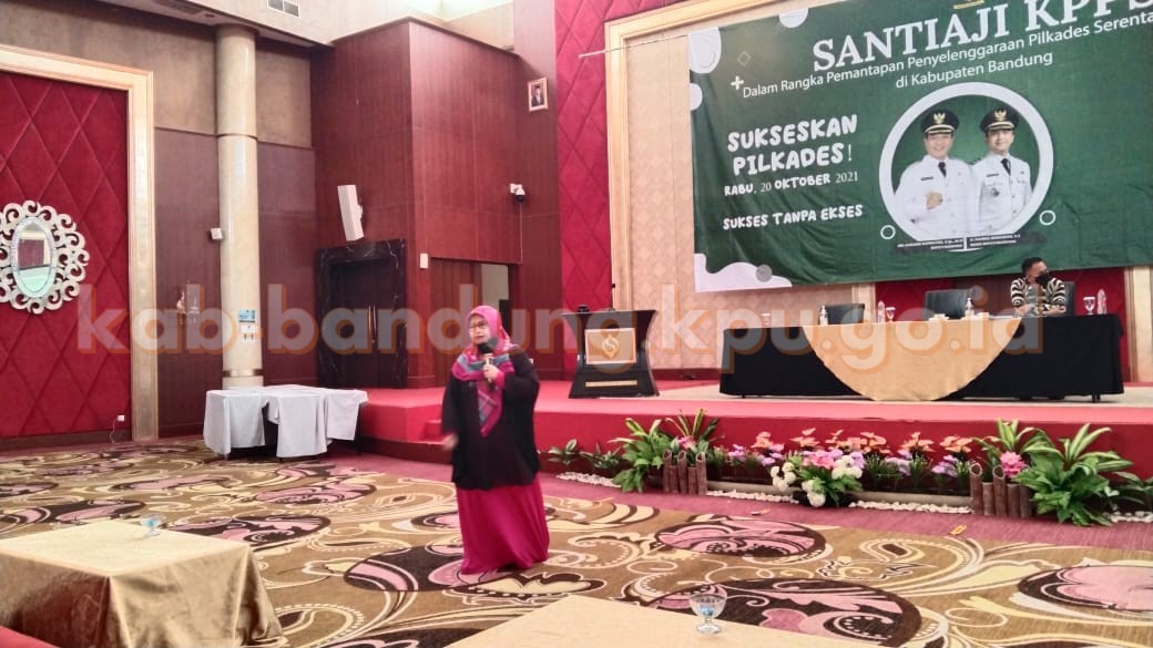 Bandung, kab-bandung.kpu.go.id – Kamis (14/10/2021), dalam rangka pemantapan penyelenggaraan Pilkades Serentak Tahun 2021 di Kabupaten Bandung, DPMD Kabupaten Bandung mengadakan Bimbingan Teknis/Santiaji bagi petugas KPPS. Acara digelar selama 2 (dua) hari sejak Rabu (13/10/2021), bertempat di Pajajaran Convention Center, Sutan Raja Hotel Soreang. Peserta kegiatan dihadiri oleh 3 (tiga) orang petugas KPPS dari 21 desa yang menyelenggarakan Pilkades. Dalam kesempatan ini, Anggota KPU kabupaten Bandung Divisi Teknis Penyelenggaraan, Siti Holisoh, diundang sebagai narasumber untuk meberikan pemaparannya terkait tahapan Pemungutan dan Penghitungan Suara di masa pandemi seperti saat ini, serta mensimulasikan pelaksanaan kerja dan tugas KPPS Pilkades di TPS. Pelaksanaan Pilkades Serentak di Kabupaten Bandung ini berdasarkan Surat Mendagri Nomor: 270/5645/SJ tentang Tindak Lanjut Pelaksanaan Pilkades Serentak dan Peralihan Antar Waktu (PAW) pada Masa Pandemi Covid-19 Pasca Penundaan. Penyelenggaraan Pilkades serentak di Kabupaten Bandung akan dilaksanakan pada tanggal 20 Oktober 2021.