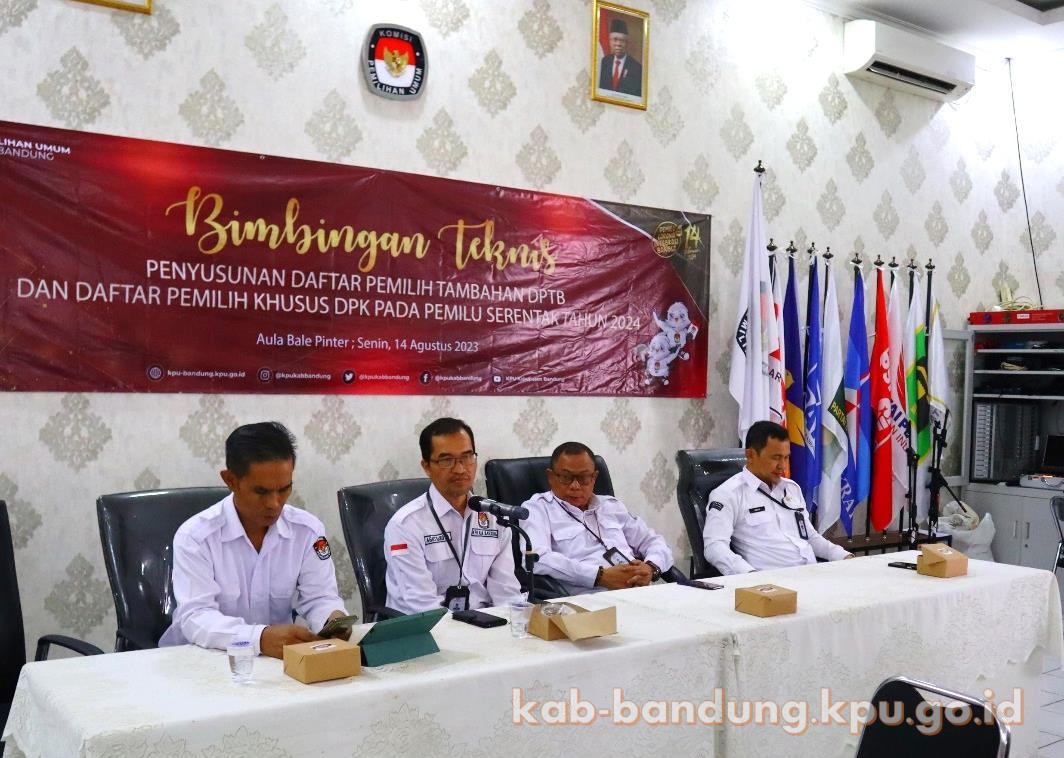 Bandung, kab-bandung.kpu.go.id – Memasuki tahapan Penyusunan Daftar Pemilih Tambahan (DPTb) dan Daftar Pemilih Khusus (DPK) pada Pemilihan Umum Tahun 2024, KPU Kabupaten Bandung menyelenggarakan Bimbingan Teknis Penyusunan Daftar Pemilih Tambahan (DPTb) dan Daftar Pemilih Khusus (DPK) di wilayah Kabupaten Bandung untuk Pemilu Tahun 2024 bersama Panitia Pemilihan Kecamatan (PPK) Se-Kabupaten Bandung. Kegiatan dilaksanakan di Aula Bale Pinter Pemilu KPU Kabupaten Bandung pada Senin (14/8/23).