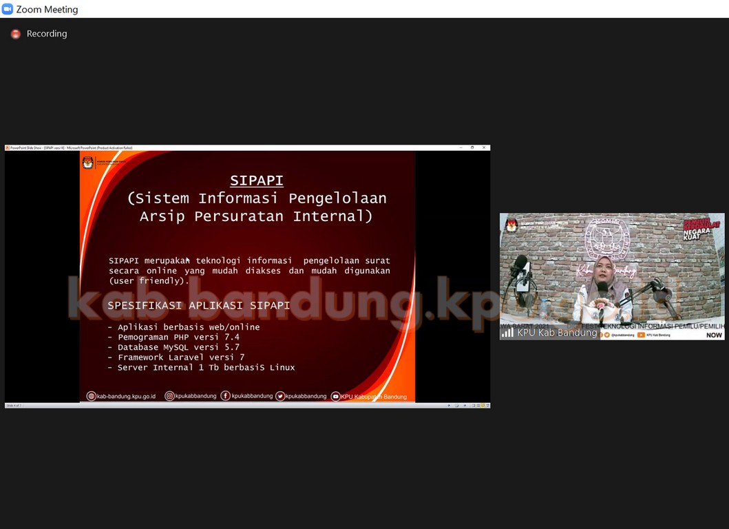 KPU Kabupaten Bandung menjadi salah satu satuan kerja yang mendapat kesempatan untuk mempresentasikan sistem informasi yang telah dibuat. Presentasi disampaikan oleh Plt. Kasubbag Umum, Ira Mutia. Dalam suatu instansi, surat-menyurat menjadi dokumen atau suatu alat komunikasi yang diakui secara sah. Selama ini sistem pengelolaan persuratan dilakukan secara manual atau konvensional. Pengelolaan secara manual memiliki beberapa kekurangan, terlebih dengan padatnya kegiatan serta mobilitas tinggi di tengah pandemi seperti saat ini. Terdapat batasan terkait protokol kesehatan yang tidak memungkinkan untuk bertemu secara langsung, sehingga KPU Kabupaten Bandung berinisiatif untuk membuat suatu aplikasi yang user friendly untuk memudahkan proses surat-menyurat tersebut, yang dinamakan SIPAPI (Sistem Informasi Pengelolaan Arsip Persuratan Internal). Aplikasi ini dapat diakses dimana saja, dapat mempercepat pelaksanaan kebijakan terutama dalam penyelenggaraan pemilu dan pemilihan. Dengan adanya aplikasi SIPAPI, proses tracking disposisi menjadi lebih mudah dan pengarsipan semakin tertib, terutama bila pencarian dokumen dibutuhkan dalam proses perselisihan hasil pemilu/pemilihan maupun saat pemeriksaan oleh Badan Pemeriksa Keuangan (BPK).