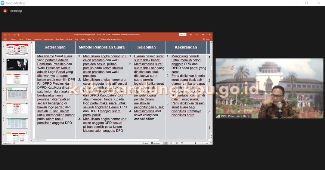 Bandung, kab-bandung.kpu.go.id – Komisi Pemilihan Umum Republik Indonesia (KPU RI) memiliki 3 (tiga) opsi model surat suara Pemilu Tahun 2024 sebagai konsep desain awal. Sesuai dengan informasi, varian opsi tersebut akan disimulasikan minggu ini oleh tim KPU RI, ungkap Endun Abdul Haq, Anggota KPU Provinsi Jawa Barat Divisi Teknis Penyelenggaraan, pada kesempatan Webinar Diskusi Divisi Teknis se-Jawa Barat terkait penyelenggaraan Pemilu dan Pemilihan Tahun 2024, Senin (7/6/2021).