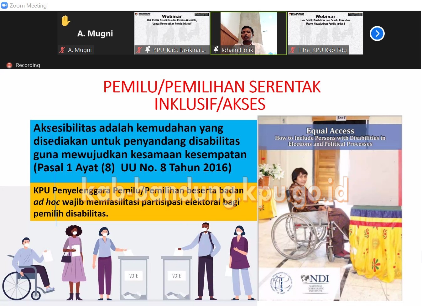Bandung, kab-bandung.kpu.go.id – “Hak Politik Disabilitas dan Pemilu Aksesible, Upaya Mewujudkan Pemilu Inklusif” menjadi tema yang diangkat dalam Webinar yang diadakan oleh KPU Kabupaten Tasikmalaya pada Jumat (18/3/22). Bertindak sebagai narasumber dalam webinar kali ini ialah Anggota KPU Provinsi Jawa Barat Idham Holik dan Komisaris Utama Bandara Internasional Jawa Barat (BIJB) yang juga pernah menjabat sebagai Ketua KPU Provinsi Jawa Barat periode 2013-2018 Yayat Hidayat. Selain diikuti oleh penyelenggara Pemilu, kegiatan ini juga dihadiri oleh Kelompok pendidik disabilitas yang terdiri dari guru-guru Sekolah Luar Biasa (SLB) di Tasikmalaya. Kegiatan ini dilaksanakan sebagai upaya KPU Kabupaten Tasikmalaya dapat memenuhi hak politik disabilitas dan mewujudkan pemilu yang inklusif.