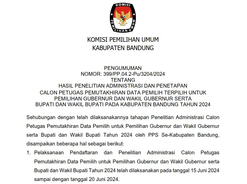 Sehubungan dengan telah dilaksanakannya tahapan Penelitian Administrasi Calon Petugas Pemutakhiran Data Pemilih untuk Pemilihan Gubernur dan Wakil Gubernur serta Bupati dan Wakil Bupati Tahun 2024 oleh PPS Se-Kabupaten Bandung. Sehubungan dengan hal tersebut di atas, disampaikan kepada Calon Petugas Pemutakhiran Data Pemilih untuk Pemilihan Gubernur dan Wakil Gubernur serta Bupati dan Wakil Bupati Pada Kabupaten Bandung Tahun 2024 terpilih untuk hadir dalam pelantikan, pengambilan sumpah/janji, dan penandatanganan pakta integritas Petugas Pemutakhiran Data Pemilih sesuai dengan jadwal yang telah ditetapkan oleh PPS di wilayahnya masing-masing.