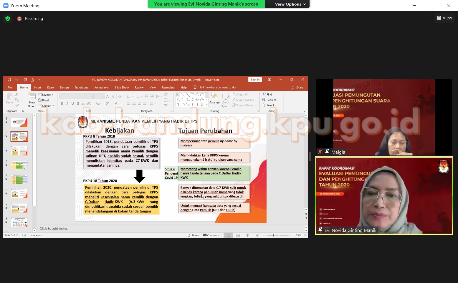Anggota KPU RI, Evi Novida Ginting Manik, selaku narasumber pada kesempatan kali ini menyampaikan bahwa evaluasi yang dilakukan menjadi suatu hal yang sangat penting. Salah satunya bertujuan untuk mengambil manfaat serta memperbaiki kekurangan dan kelemahan yang terjadi pada saat Pemilihan Tahun 2020. Inilah pertama kalinya KPU menggunakan pemanfaatan teknologi informasi melalui Sirekap yang digunakan oleh Kelompok Penyelenggara Pemungutan Suara (KPPS). Dalam tahapan tungsura, salah satu formulir yang paling sering digunakan adalah model C.Daftar Hadir. Dalam mekanisme pendataan pemilih yang hadir di TPS pada Pemilihan Tahun 2020, dilakukan dengan cara petugas KPPS meneliti kesesuaian nama pemilih dengan formulir model C.Daftar Hadir. Apabila telah sesuai, pemilih mendatangani formulir daftar hadir tersebut.