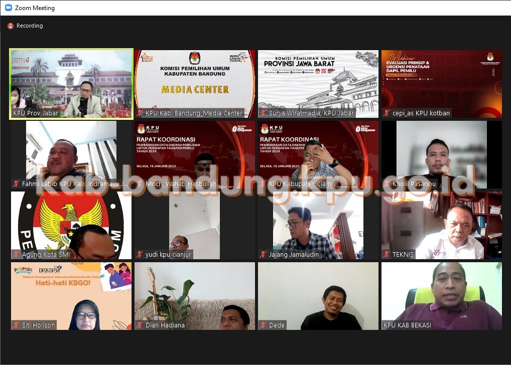 Menyongsong pelaksanaan tahapan Pemilu Tahun 2024, KPU Provinsi Jawa Barat kembali mengadakan rapat koordinasi bersama KPU Kabupaten/Kota se-Jawa Barat secara daring, pada Kamis, 27 Januari 2022. Poin-poin pembahasan pada rapat koordinasi kali ini difokuskan pada 3 hal, yaitu sinkronisasi Daftar Agregat Kependudukan Kecamatan (DAK2), tindak lanjut surat dari KPU Nomor: 41/PP.07/05/2022 tanggal 17 Januari 2022 perihal Permintaan Rekap Data Dapil Untuk Persiapan Tahapan Pemilu Tahun 2024, serta simulasi penyusunan dapil dan alokasi kursi anggota DPRD Kabupaten/Kota pada Pemilu Tahun 2019 menggunakan DAK2 Semester I Tahun 2021.
