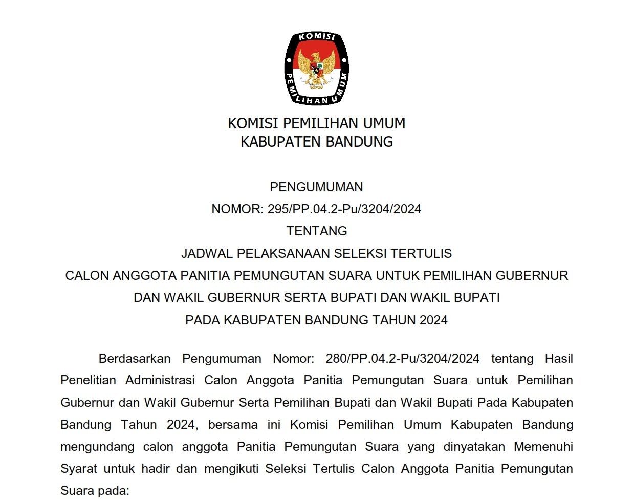 Berdasarkan Pengumuman Nomor: 280/PP.04.2-Pu/3204/2024 tentang Hasil Penelitian Administrasi Calon Anggota Panitia Pemungutan Suara untuk Pemilihan Gubernur dan Wakil Gubernur Serta Pemilihan Bupati dan Wakil Bupati Pada Kabupaten Bandung Tahun 2024, bersama ini Komisi Pemilihan Umum Kabupaten Bandung mengundang calon anggota Panitia Pemungutan Suara yang dinyatakan Memenuhi Syarat untuk hadir dan mengikuti Seleksi Tertulis Calon Anggota Panitia Pemungutan Suara.