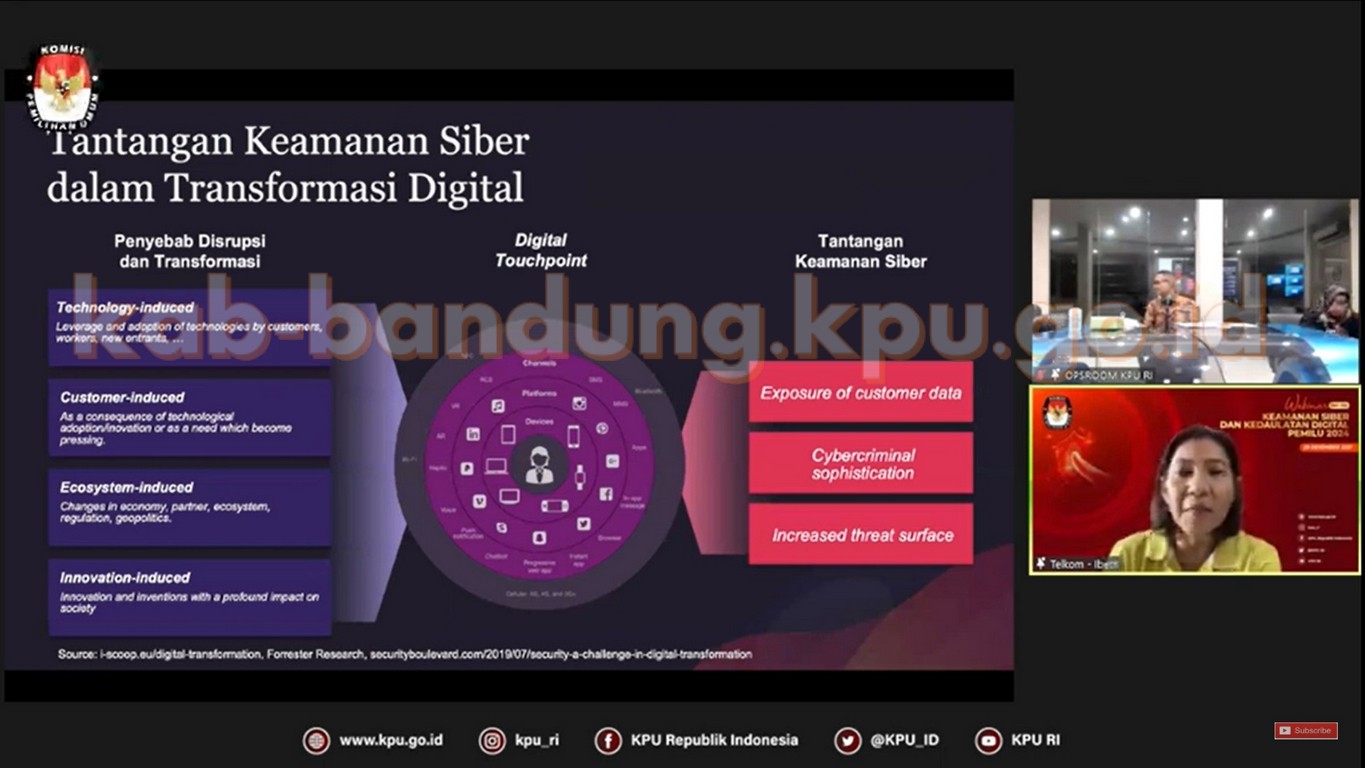 OVP Cybersecurity PT. Telkom Indonesia, Elysabeth Damayanti, menambahkan pada kesempatan ini mengenai Pengelolaan Keamanan Siber menuju Kedaulatan Digital. Di era saat ini, adanya pandemi menjadi trigger kesuksesan digital transformasi, dimana semua orang terpaksa berpindah dari aktivitas fisik menjadi aktivitas menggunakan media digital. Tranformasi digital juga disebabkan karena adanya disrupsi pada berbagai aspek kehidupan, seperti bagaimana perkembangan teknologi digital mengubah kehidupan saat ini dan tuntutan dari customer mengenai adanya kemudahan. Dalam konteks pemilu yang menjadi customer adalah para peserta dan pemilih. Adanya ekosistem yang menuntut sebuah korporasi atau kementrian dan lembaga untuk beralih menggunakan teknologi digital, serta adanya inovasi yang berkembang di dunia, juga menjadi penyebab atau latar belakang terjadinya disrupsi dan transformasi digital.