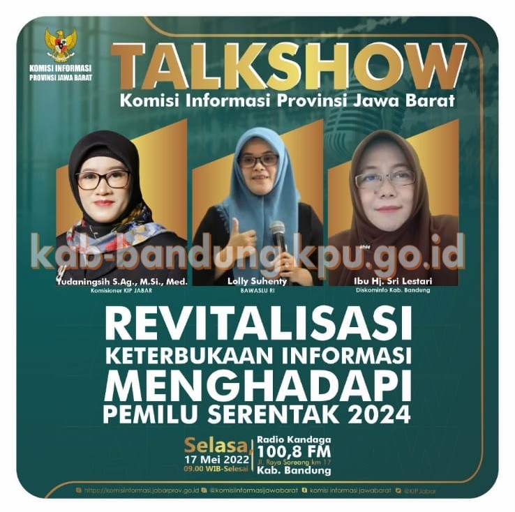 Bandung, kab-bandung.kpu.go.id – KPU Kabupaten Bandung mengikuti Talkshow Keterbukaan Informasi Publik yang digelar oleh Komisi Informasi (KI) Provinsi Jawa Barat dengan tema Revitalisasi Keterbukaan Informasi menghadapi Pemilu Serentak 2024, disiarkan langsung melalui Radio Kandaga Kabupaten Bandung pada Selasa (17/5/22). Dengan menghadirkan 3 (tiga) narasumber yakni Yudaningsih, S.Ag., M.Si., Komisioner KI Jawa Barat, Lolly Suhenti, S.Sos.I., M.H., Komisioner Bawaslu RI serta Hj. Sri Lestari, selaku Kepala Seksi Pengelolaan Informasi dan Dokumentasi, Dinas Komunikasi dan Informasi Kabupaten Bandung.