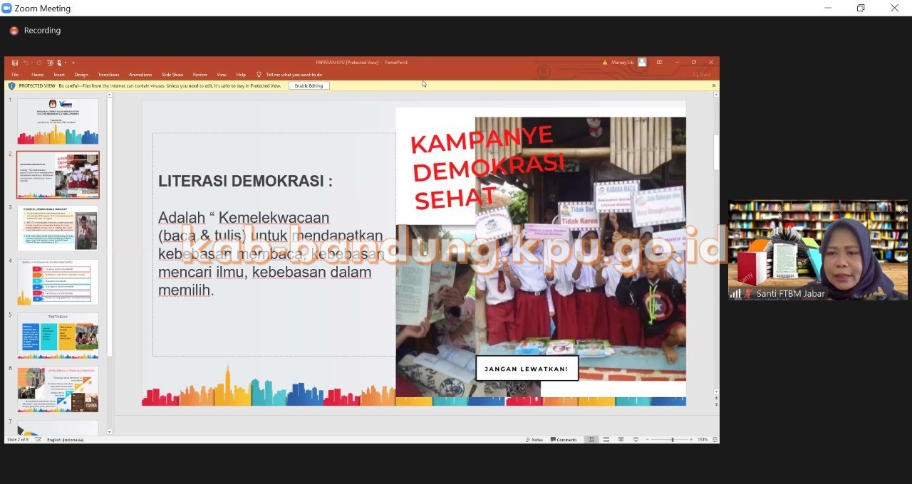 Bandung, kab-bandung.kpu.go.id – Jumat (23/04/2021) Komisi Pemilihan Umum (KPU) Kabupaten Bandung mengikuti webinar Bincang Nongkrong Demokrasi dan Pemilihan (BINOKASIH) yang diselenggarakan oleh KPU Kabupaten Sumedang. Webinar yang bertajuk “Pengaruh Literasi dalam Meningkatkan Kualitas Demokrasi dan Pemilih Cerdas” ini menghadirkan dua orang narasumber, yang terdiri dari Plt. Ketua Forum Taman Bacaan Masyarakat Jawa Barat, Santi Susilawati, dan Anggota KPU Provinsi Jawa Barat, Idham Holik. Webinar tersebut juga diikuti oleh KPU Provinsi dan KPU Kabupaten/Kota di luar Jawa Barat.