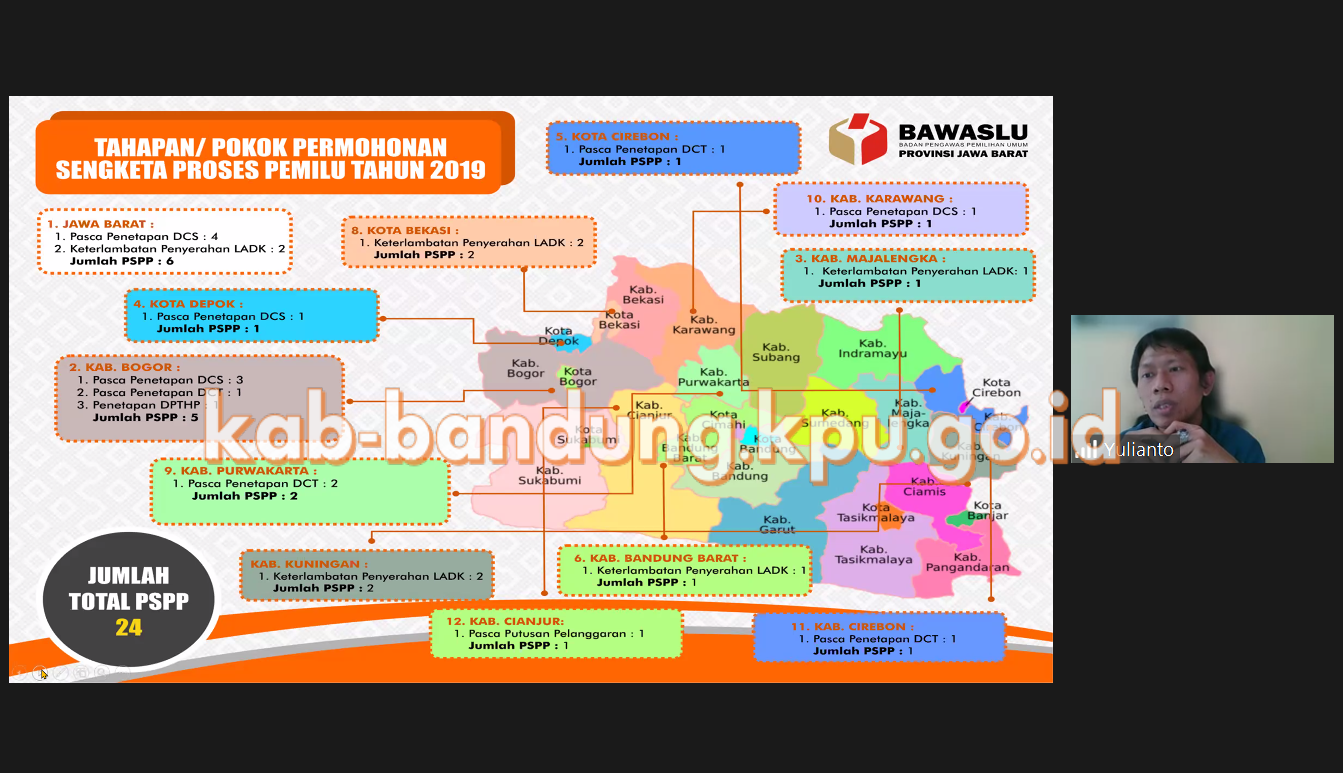 Yulianto menambahkan, dalam menghadapi sengketa proses Pemilu Tahun 2024 nanti terdapat beberapa tantangan yang harus dihadapi oleh Bawaslu terkait kesiapan kelembagaan, kemudian mengenai kerangka regulasi, serta penyelenggaraan pemilu yang masih berpotensi dilaksanakan di tengan pandemi seperti saat ini. Sehingga Bawaslu Provinsi Jawa Barat harus merancang dan mempunyai strategi dalam peningkatan kualitas dan kapasitas jajarannya untuk penyelesaian sengketa serta merumuskan metode baru yang inovatif dalam menjawab tantangan kinerja penyelesaian sengketa Pemilu Tahun 2024, tutup Yulianto. (Humas KPU Kabupaten Bandung).