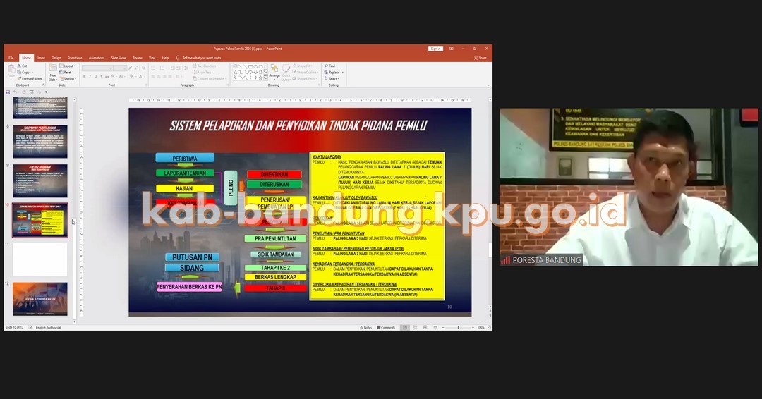 Komarudin menyampaikan bahwa yang menjadi kendala utama dalam ruang penanganan adalah waktu yang sempit. Ini yang kemarin menjadi kendala, namun tetap kita laksanakan dengan maksimal. Seperti yang dijelaskan Wakasat Reskrim tadi bahwa kami Bawaslu tidak sendiri, kami dibantu dan bergabung dalam Sentra Gakkumdu. Alur dari penanganan temuan/laporan diawali dengan adanya laporan, kajian awal perbaikan kelengkapan laporan, registrasi, kajian dugaan pelanggaran, penelusuran, penyidikan, dan penuntutan. Terdapat 3 (tiga) tahap penanganan. Pertama di ruang Bawaslu, kedua di ruang Kepolisian, ketiga di ruang penuntutan Kejaksaan, kemuadian masuk di pengadilan lalu menghasilkan hasil penanganan. Penyelenggaraan Pemilu/Pemilihan adalah implementasi dari pelaksanaan demokrasi, bagaimana kita menyampaikan suara kita secara cerdas. Untuk melahirkan pemimpin yang amanah, jangan biarkan peserta Pemilu/Pemilihan berbuat kesalahan atau kita mendorong untuk melakukan pelanggaran, mari sama-sama laksanakan penyelenggaraan Pemilu/Pemilihan sesuai dengan regulasi, tutup Komarudin. (Humas KPU Kabupaten Bandung)