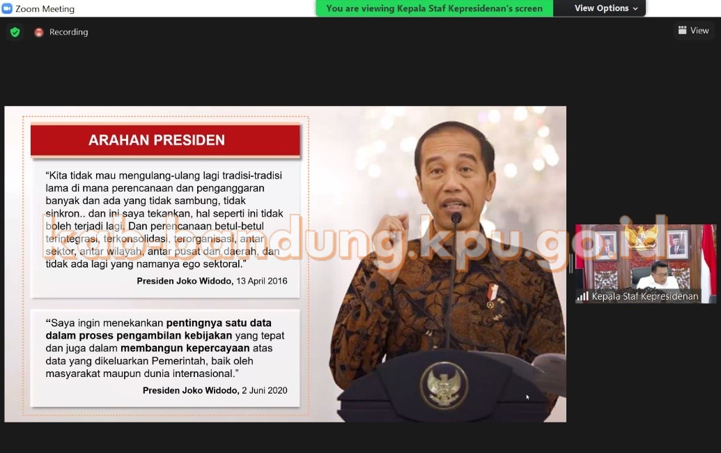 Deputi IV Kepala Staf Kepresidenan Bidang Informasi dan Komunikasi Politik, Juri Ardianto, menyatakan Satu Data dan konektivitas data antar lembaga merupakan hal yang penting. Namun yang perlu disusun segera adalah tindak lanjut dari Perpres tentang Satu Data yang kemudian dihubungkan secara teknis oleh kementerian/lembaga lain untuk dapat saling terkoneksi. Pemerintah dan KPU sebagai penyelenggara sebaiknya memiliki cara pandang yang sama terkait dengan ketersediaan data penduduk dan penyediaan data pemilih, sehingga perihal data ini tidak menjadi sumber masalah. Biasanya permasalahan yang muncul adalah ketika pemerintah memiliki data yang sama dengan sistem informasi yang berbeda dengan KPU sebagai penyelenggara pemilu, sehingga ketika terjadi sinkronisasi akan menimbulkan distrosi. Untuk itu dukungan teknologi informasi juga menjadi penting agar semakin diperhatikan oleh kementrian/lembaga. (Humas KPU Kabupaten Bandung)