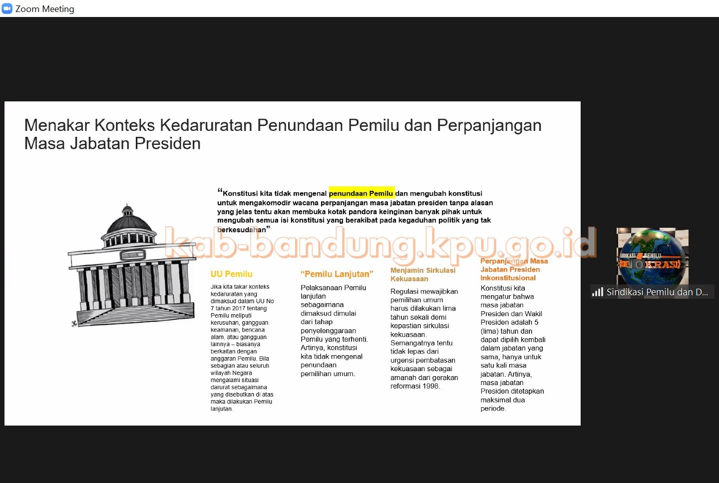 Sementara Erik Kurniawan, Peneliti Sindikasi Pemilu dan Demokrasi, mengatakan isu penundaan Pemilu 2024 muncul karena adanya tingkat persaingan elektoral yang rendah dapat melemahkan konstitusionalisme dalam banyak cara, mulai dari melemahnya insentif untuk otonomi yudisial, hingga mendorong adopsi lembaga eksekutif yang berkonsentrasi pada kekuasaan secara ekstrem. Tantangan bagi Partai politik saat ini adalah untuk terus memegang komitmen yang telah disepakati bahwa Pemilu dilaksanakan pada 14 Fenruari 2024. Ditekankan oleh Erik Kurniawan, bahwa komitmen dari partai politik, Penyelenggara Pemilu baik KPU maupun Bawaslu serta pemerintah untuk tetap menyelenggarakan Pemilu 2024 sesuai ketentuan konstitusi menjadi poin yang sangat penting untuk menjawab keresahan publik yang telah disuguhkan dengan wacana penundaan pemilu. (Humas KPU Kabupaten Bandung).