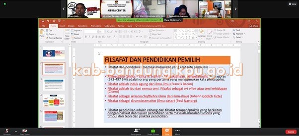 Bandung, kab-bandung.kpu.go.id – Komisi Pemilihan Umum (KPU) Kabupaten Bandung mengikuti kegiatan Webinar dengan Topik Mendaulatkan Pemilih dalam Tujuan Filsafat Pendidikan Pemilih yang diselenggarakan oleh KPU Kota Tasikmalaya berkolaborasi dengan KPU Kabupaten Indramayu pada Kamis (29/4/2021). Dipandu oleh moderator Anggota KPU Indramayu Divisi Sosialisasi Partisipasi Masyarakat, Dewi Nurmalasari, M.A. serta narasumber Dr. H. Idham Holiq, S.E., M.Si. selaku Anggota KPU Provinsi Jawa Barat Divisi Sosialisasi dan Pendidikan Pemilih. Webinar diawali dengan pengantar dari Ketua KPU Kota Tasikmalaya, Ade Zaenul Mutaqin, M.Ag.