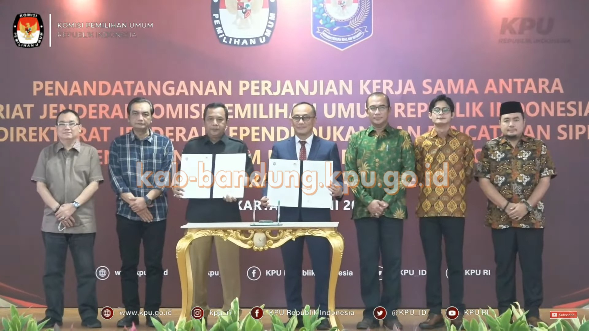 Bandung, kab-bandung.kpu.go.id – Sekretariat Jenderal KPU Republik Indonesia (KPU RI) baru saja melakukan Penandatangan Perjanjian Kerjasama dengan Direktorat Jenderal Kependudukan dan Pencatatan Sipil Kementerian Dalam Negeri (Ditjen Dukcapil Kemendagri) sekaligus penyerahan Hak Akses NIK, pada Rabu (29/6/22) bertempat di Ruang Sidang Utama Kantor KPU RI. Penandatanganan Perjanjian Kerjasama tentang Pemanfaatan Nomor Induk Kependudukan, Data Kependudukan, dan Kartu Tanda Penduduk Elektronik dalam Pemutakhiran Data Pemilih tersebut, dilakukan oleh Sekretaris Jenderal KPU RI, Bernad Dermawan Sutirsno bersama dengan Direktur Jenderal Kependudukan dan Pencatatan Sipil Kemendagri, Prof. Dr. Zudan Arif Fakhrulloh, SH, MH., disaksikan oleh Ketua KPU RI Hasyim Asy’ari beserta jajaran Anggota KPU RI, dilanjutkan dengan penandatanganan Berita Acara Serah Terima User ID Hak Akses dan User ID Data Balikan KPU RI, yang nantinya data base tersebut dapat diakses oleh seluruh KPU baik di tingkat Provinsi maupun tingkat Kabupaten/Kota sehingga lebih mudah dalam melakukan pengawasan.