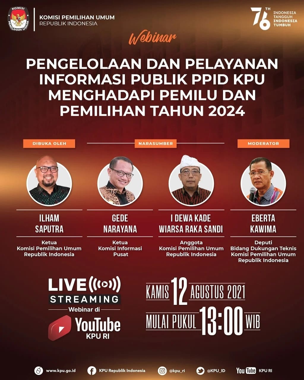 Lebih lanjut I Dewa menyampaikan peran penting PPID KPU sebagai penyedia Informasi Kepemiluan dan Kelembagaan menuju Pemilu 2024 nanti yang meliputi 1) Penyebarluasan (Diseminasi) informasi kepemiluan dan kelembagaan yang dibarengi dengan peningkatan kualitas pelayanan public; 2) PPID KPU diharapkan dapat menjadi pelayan publik yang terinformatif dalam menyediakan informasi kepemiluan dari para pemohon; 3) Menciptakan inovasi yang kekinian dalam pelayanan informasi secara efektif, cepat, dan terintegrasi dalam hal informasi kepemiluan; 4) Membangun dan meningkatkan kepercayaan public (trust) terhadap penyelenggara, dan hasil pemilu dari keterbukaan informasiyang diberikan; dan 5) Menjadi yang terdepan melawan disinformasi, ujaran kebencian dan hoaks (berita bohong) kepemiluan dan kelembagaan penyelenggara pemilu.
