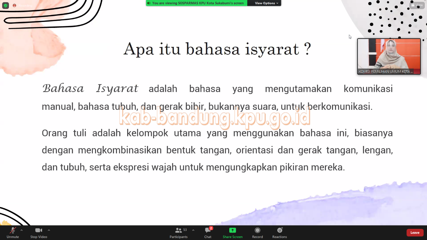 Bandung, kab-bandung.kpu.go.id – Bahasa isyarat adalah bahasa yang mengutamakan komunikasi manual, bahasa tubuh, dan gerak bibir, bukan suara untuk berkomunikasi. Orang tuna rungu adalah kelompok utama yang menggunakan bahasa ini, biasanya dengan mengkombinasikan bentuk tangan, orientasi dan gerakan tangan, lengan, dan tubuh serta ekspresi wajah untuk mengungkapkan pikiran mereka. Hal ini disampaikan oleh Santi Eka Permana sebagai Ketua Bahasa Isyarat Indonedia (Bisindo) Sukabumi dalam kegiatan Pelatihan Bahasa Isyarat yang diselenggarakan KPU Kota Sukabumi secara daring, Rabu (7 Juli 2021).