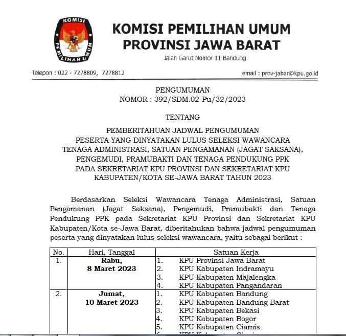 PEMBERITAHUAN JADWAL PENGUMUMAN PESERTA YANG DINYATAKAN LULUS SELEKSI WAWANCARA SELEKSI TENAGA ADMINISTRASI, SATUAN PENGAMANAN (JAGAT SAKSANA), PENGEMUDI, PRAMUBAKTI DAN TENAGA PENDUKUNG PPK SEKRETARIAT KPU PROVINSI DAN SEKRETARIAT KPU KABUPATEN/KOTA SE-JAWA BARAT TAHUN 2023, SELENGKAPNYA DAPAT DIUNDUH DISINI