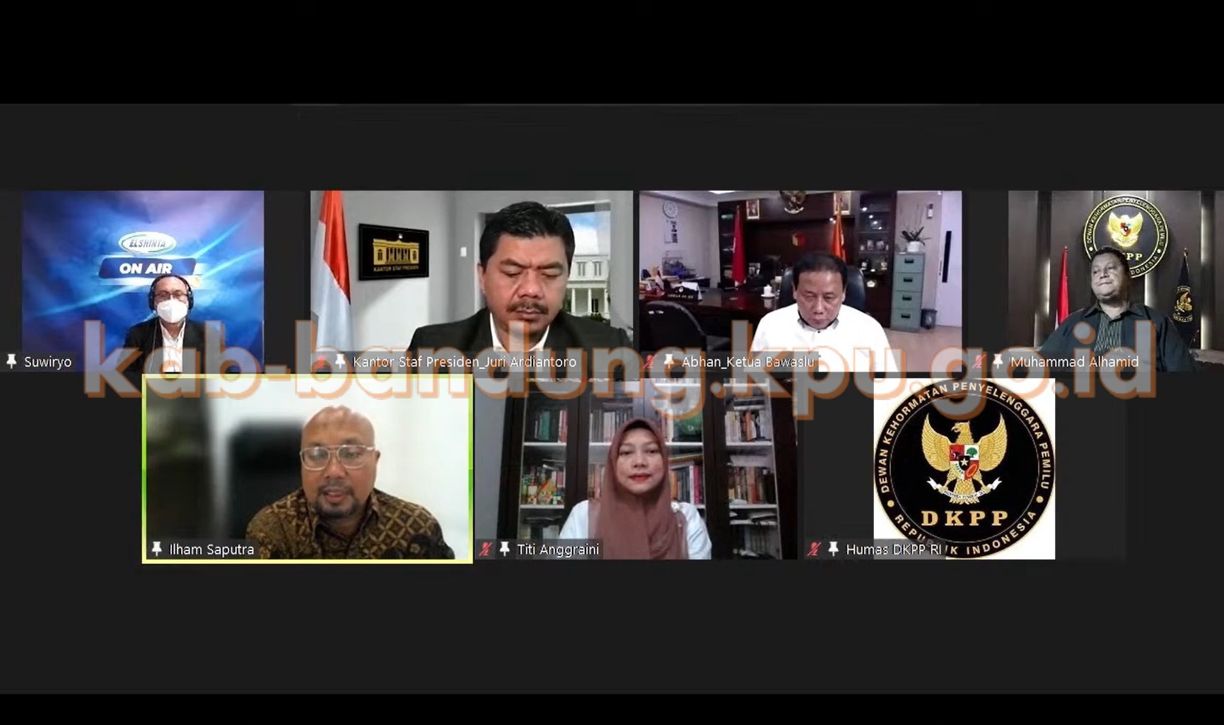 Bandung, kab-bandung.kpu.go.id – Getar Pemilu 2024 merupakan salah satu program baru dari Radio Elshinta yang akan membahas tentang Pemilu Serentak 2024. Acara kali ini bertajuk “Pemilu Serentak 2024, Siapkah?” dilakukan secara live streaming melalui chanel YouTube Radio Elshinta pada Senin, 14 Februari 2022. Pembicara yang dihadirkan yakni Ketua Komisi II DPR, Ahmad Doli Kurnia, Ketua KPU, Ilham Saputra, Ketua Bawaslu, Abhan, Ketua DKPP, Muhammad, Dewan Pembina Perludem, Titi Anggraini, serta Deputi IV Kepala Staf Kepresidenan, Juri Ardiantoro.