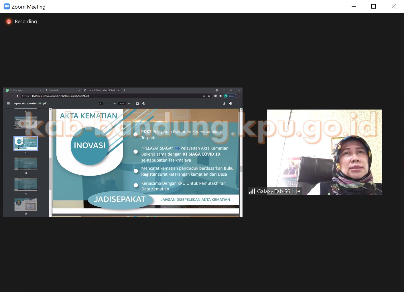 Narasumber selanjutnya, Wini, memberikan pemaparannya mengenai Pencatatan Kematian Sebagai upaya Akurasi Data Menuju Pemilu Tahun 2024. Seperti diketahui bahwa akta kematian selalu sulit dikarenakan tidak adanya pendataan untuk penduduk yang meninggal dunia. Padahal menurut Wini, yang berkewajiban melaporkan kematian ialah pihak keluarga ataupun petugas dari lingkungan RT/RW setempat. Layanan Adminduk di Kabupaten Tasikmalaya sampai dengan saat ini dapat dilakukan secara daring melalui Whatsapp, maupun secara tatap muka yang dapat dilakukan di kecamatan dan Disdukcapil. Disdukcapil berusaha agar pelayanan tetap berjalan di tengah situasi pandemi ini sesuai dengan kebijakan Adminduk untuk pelayanan secara online dan tatap muka, dan melakukan sosialisasi secara berjenjang dengan SKPD, Kecamatan, UPTD, Desa melalui rapat koordinasi, sosialisasi melalui media sosial. Adanya pelayanan keliling dan inovasi sebagai upaya agar pencatatan akta kematian lebih tinggi, diantaranya pelayanan dokumen kependudukan terpadu, pelayanan perekaman KTP-el bagi penyandang disabilitas, Jompo ke desa-desa dan daerah terpencil, pelayanan integrasi perekaman antar kecamatan, pelayanan perekaman dan pencetakan KTP-el, pelayanan perekaman ke sekolah dan pesantren, pelaksanaan pelayanan keliling melalui koordinasi lintas OPD terkait dan pelayanan lintas sektor KIA.