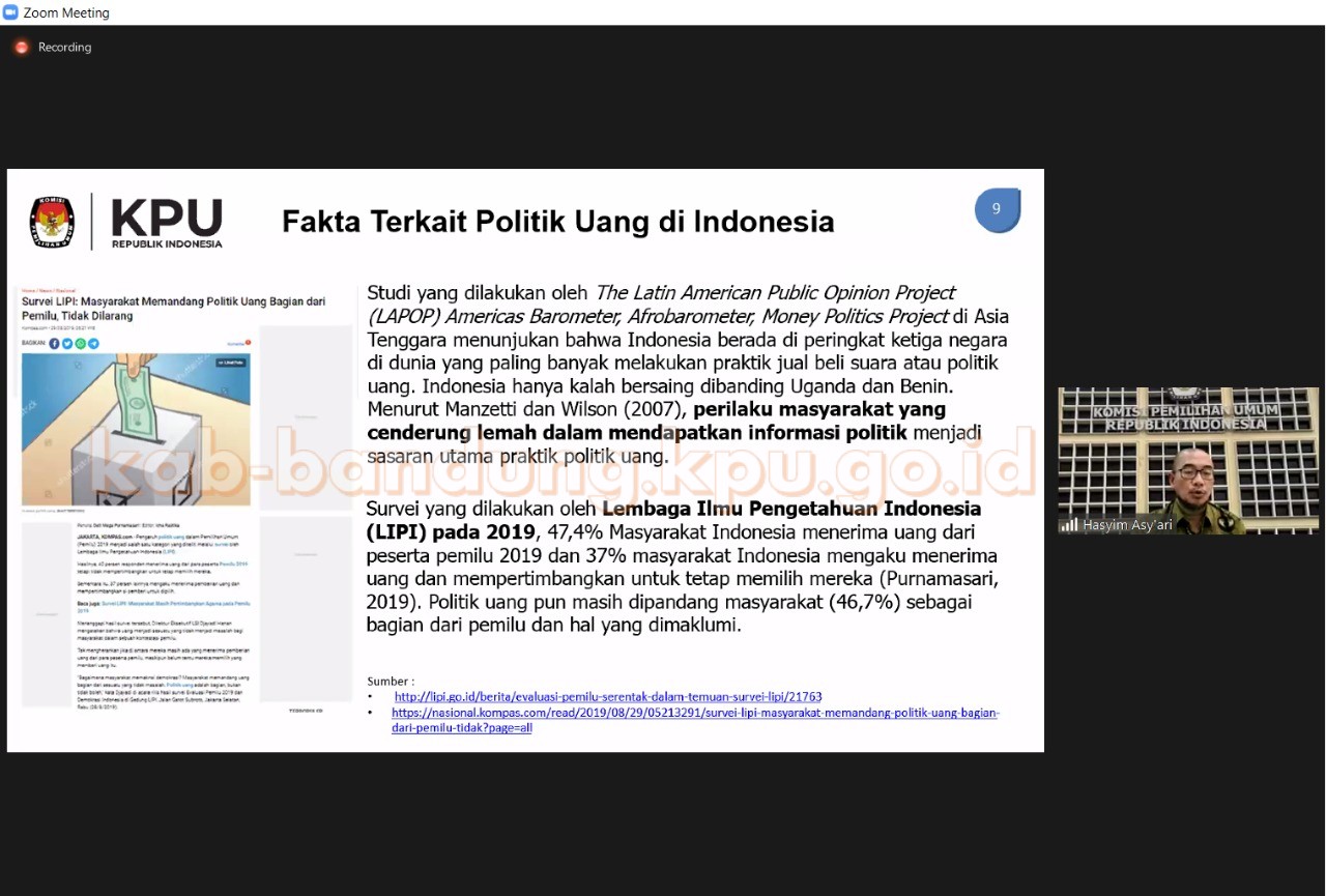 Bandung, kab-bandung.kpu.go.id – Selasa (5/10/2021), KPU RI Kembali melanjutkan kegiatan webinar Desa Peduli Pemilu dan Pemilihan (DP3) yang memasuki seri ke-4. Tema yang diangkat adalah Pendidikan Pemilih dalam Pencegahan Politik Uang pada Pemilu dan Pemilihan. Ketua KPU RI, Ilham Saputra, menyampaikan bahwa KPU tidak hanya bertugas untuk menyelenggarakan pemilu, tetapi juga memberikan penyadaran kepada masyarakat, dalam hal ini sosialisasi dan pendidikan pemilih, agar seluruh tahapan penyelenggaraan berlangsung dengan baik. Salah satu penguatan demokrasi diseluruh negara adalah penyelenggaraan pemilu yang free and fair election untuk dapat meminimalisir tindakan-tindakan yang melanggar peraturan undang-undang. Diskusi pada hari ini membahas mengenai politik uang dan pencegahannya, yang mana politik uang merupakan tindakan setiap orang yang dengan sengaja melakukan perbuatan melawan hukum menjanjikan atau memberikan uang sebagai imbalan kepada warga negara Indonesia, baik secara langsung maupun tidak langsung kepada pemilih, agar bisa untuk tidak menggunakan hak pilih, bisa juga untuk menggunakan hak pilih dengan cara tertentu sehingga suara menjadi tidak sah kemudian diarahkan memilih calon tertentu. Oleh karena KPU bekerja sesuai peraturan undang-undang yang ada, KPU berusaha semaksimal mungkin untuk memberikan pemahaman kepada masyarakat bagaimana praktik politik uang dalam proses penyelenggaraan pemilu dan pemilihan. Diharapkan dengan program pendidikan pemilih ini dapat memberikan kesadaran kepada masyarakat bahwa politik uang merusak dan mencederai demokrasi.