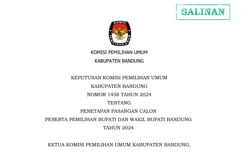 Bahwa untuk melaksanakan ketentuan Pasal 120 ayat (4) Peraturan KPU Nomor 8 Tahun 2024 tentang Pencalonan Gubernur dan Wakil Gubernur, Bupati dan Wakil Bupati, serta Walikota dan Wakil Walikota sebagaimana telah diubah dengan Peraturan KPU Nomor 10 Tahun 2024 tentang Perubahan Atas Peraturan KPU Nomor 8 Tahun 2024 tentang Pencalonan Gubernur dan Wakil Gubernur, Bupati dan Wakil Bupati, serta Walikota dan Wakil WalikotaKPU Kabupaten Bandung telah melaksanakan Rapat Pleno Tertutup terkait Penetapan Pasangan Calon Bupati dan Wakil Bupati Tahun 2024, KPU Kabupaten Bandung mengumumkan: