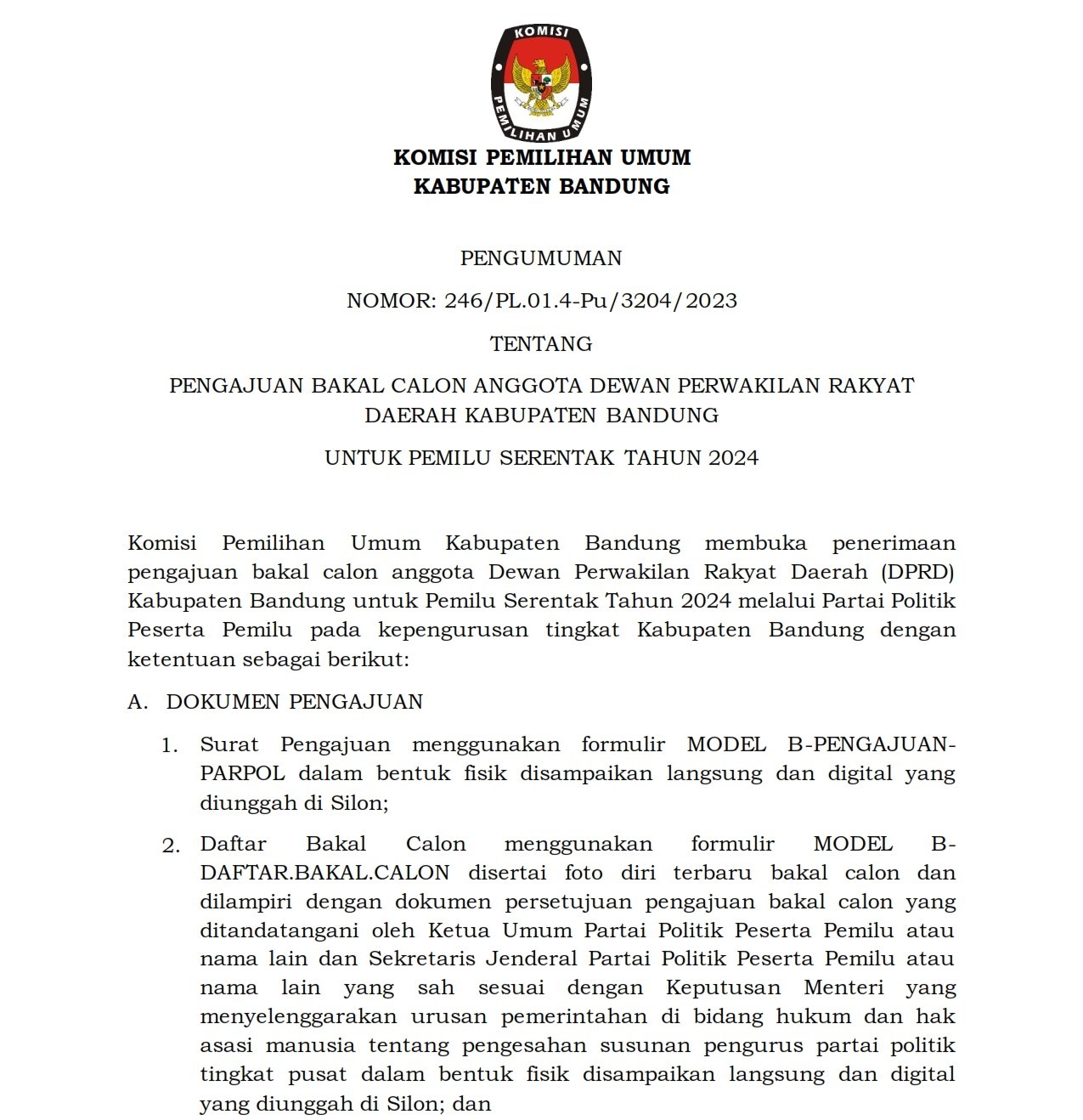 Komisi Pemilihan Umum Kabupaten Bandung membuka penerimaan pengajuan bakal calon anggota Dewan Perwakilan Rakyat Daerah (DPRD) Kabupaten Bandung untuk Pemilu Serentak Tahun 2024 melalui Partai Politik Peserta Pemilu pada kepengurusan tingkat Kabupaten Bandung
