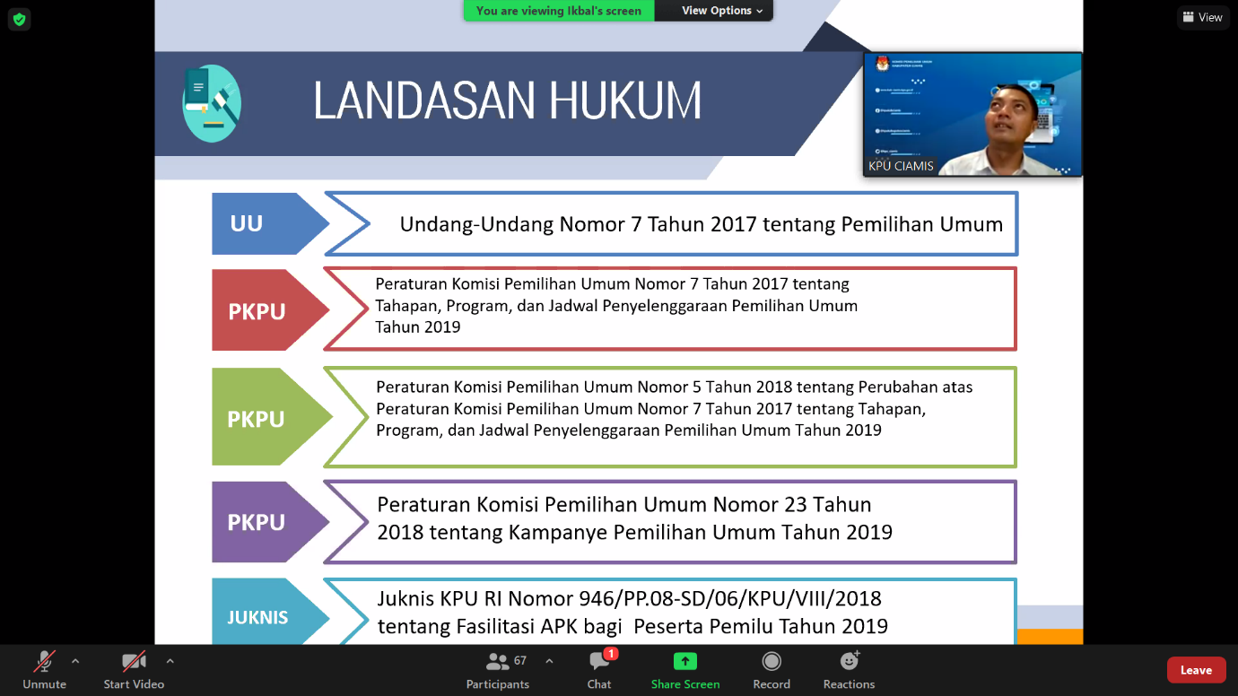 Bandung, kab-bandung.kpu.go.id – Rabu (23/06/2021), KPU Kabupaten Ciamis menyelenggarakan webinar dengan tema "Bincang Pemilu dan Demokrasi bersama mantan Penyelenggara di Tingkat Kecamatan Panitia Pemilihan Kecamatan (PPK) dan Panitia Pengawas Kecamatan (Panwascam)". Penyelenggaraan Pemilu/Pemilihan ini memiliki tantangan yang cukup luar biasa, apalagi dimasa pandemi, rekan-rekan kita di 8 (delapan) kabupaten/kota di Jawa Barat yang menyelenggarakan Pemilihan Serentak Tahun 2020 telah membuktikan penyelenggaran kontestasi dengan sukses, lancar dan selamat, ujar ketua KPU Kabupaten Ciamis, Agus Fatah Hidayat, saat membuka acara webinar.