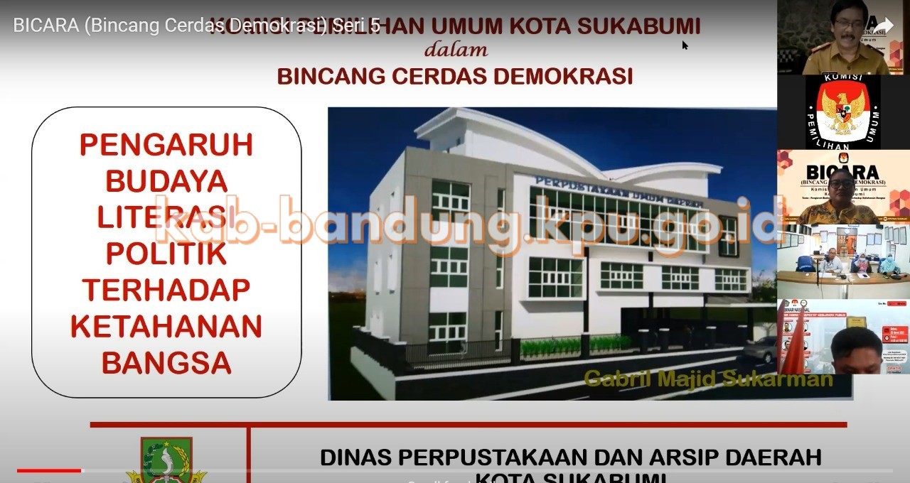Bandung, kab-bandung.kpu.go.id – Dalam rangka memperingati Hari Buku Nasional dan Hari Kebangkitan Nasional, Komisi Pemilihan Umum (KPU) Kota Sukabumi mengadakan webinar BICARA (Bincang Cerdas Demokrasi) Seri ke-5 (lima) melalui media daring dengan tema Pengaruh Budaya Literasi Politik Terhadap Ketahanan Bangsa. KPU Kota Sukabumi menghadirkan narasumber yaitu Dr. H. Idham Holik, SE., M.Si, sebagai Anggota KPU Provinsi Jawa Barat, Dr. Jeanne Francoise S.Hum, M.Si (Han), CIQnR., CIQaR., sebagai Dosen Prodi DRK Universitas Pertahanan RI & Peneliti Warisan Pertahanan (Defense Heritage) Balitbang Kemhan RI, dan Drs. H. Gabriel Majid Sukarman,M.Pd., sebagai Kepala Dinas Perpustakaan dan Kearsipan Kota Sukabumi. Masyarakat yang melek politik adalah warga negara yang sadar akan hak dan kewajibannya politiknya. Tingkat partisipasi menentukan kualitas pemilih, hal ini dapat dipengaruhi pula oleh pengaruh budaya literasi di daerah/wilayah tertentu, ungkap Ketua KPU Kota Sukabumi, Sri Utami. Sejauh mana literasi politik kita, apa kaitannya dengan kebangkitan nasional? dari sinilah kita akan menemukan korelasinya dengan membahas bersama melalui diskusi ini.