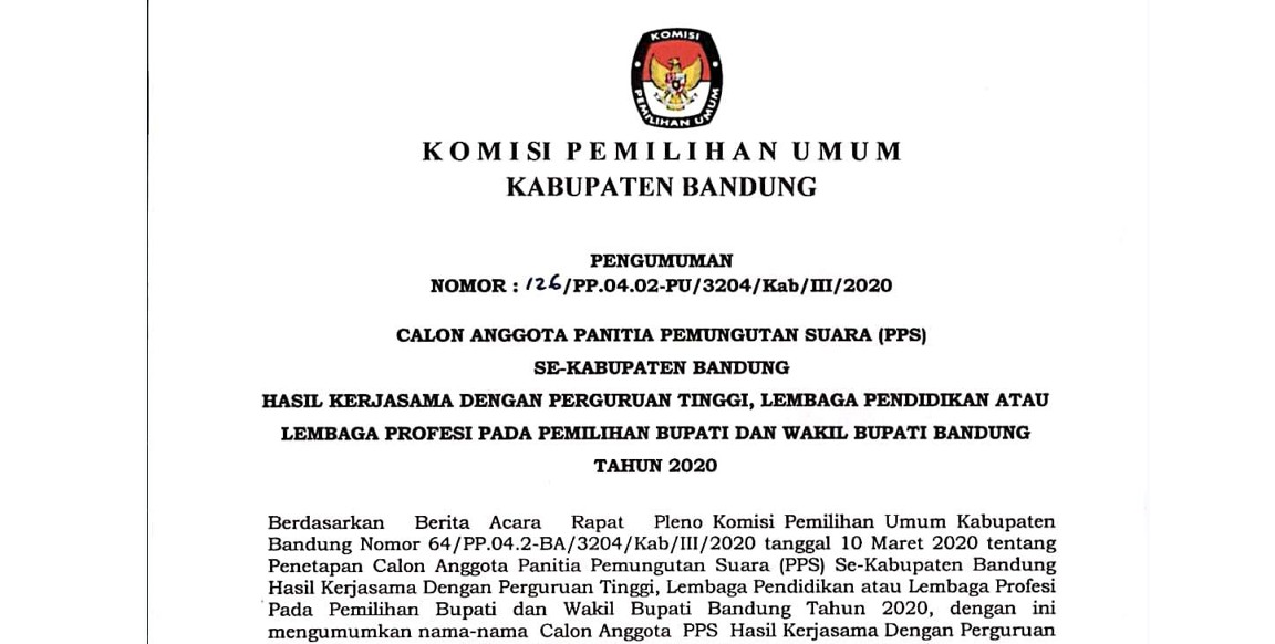 Calon Anggota Panitia Pemungutan Suara (PPS) se-Kabupaten Bandung Hasil Kerjasama dengan Perguruan Tinggi, Lembaga atau Lembaga Profesi pada Pemilihan Bupati dan Wakil Bupati Bandung Tahun 2020, selengkapnya dapat DIUNDUH DI SINI