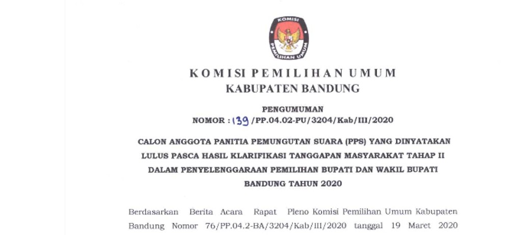 Calon Anggota Panitia Pemungutan Suara (PPS) yang Dinyatakan Lulus Pasca Hasil Klarifikasi Tanggapan Masyarakat Tahap II dalam Pemilihan Bupati dan Wakil Bupati Bandung Tahun 2020, selengkapnya dapat DIUNDUH DI SINI