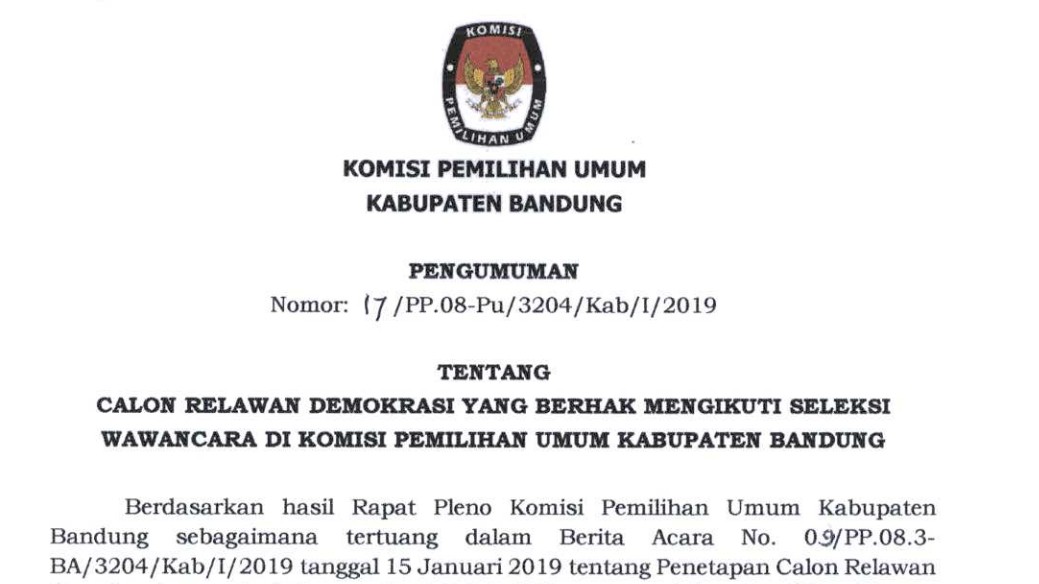 Pengumuman tentang Calon Relawan Demokrasi pada Pemilu Tahun 2019 yang berhak mengikuti seleksi wawancara, selengkapnya dapat DIUNDUH DI SINI.