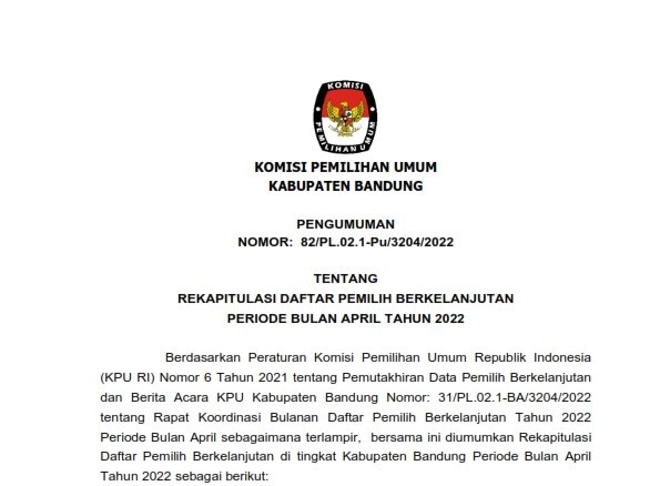 Pengumuman dan Berita Acara Rekapitulasi Daftar Pemilih Berkelanjutan (DPB) Periode Bulan April Tahun 2022 Tingkat Kabupaten Bandung, selengkapnya dapat DIUNDUH DISINI