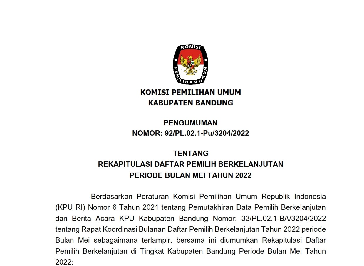 Pengumuman dan Berita Acara Rekapitulasi Daftar Pemilih Berkelanjutan (DPB) Periode Bulan Mei Tahun 2022 Tingkat Kabupaten Bandung, selengkapnya dapat DIUNDUH DISINI
