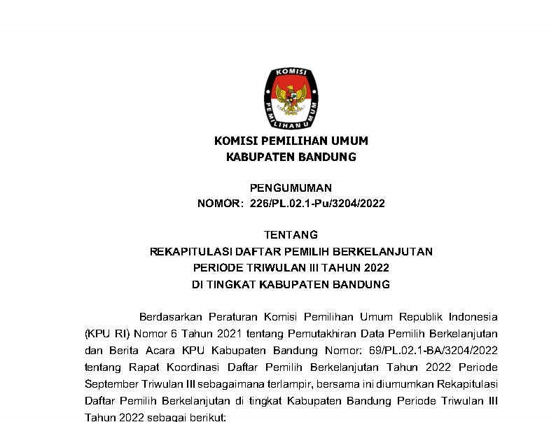 Pengumuman dan Berita Acara Rekapitulasi Daftar Pemilih Berkelanjutan (DPB) Periode Triwulan III Tahun 2022 Tingkat Kabupaten Bandung, selengkapnya dapat DIUNDUH DISINI
