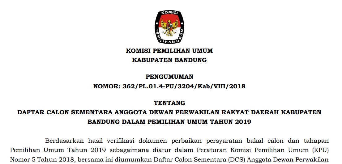 Pengumuman tentang Daftar Calon Sementara Anggota DPRD Kabupaten Bandung pada Pemilu Tahun 2019, selengkapnya dapat DIUNDUH DI SINI.