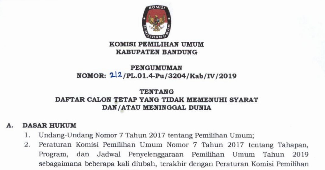 Pengumuman Daftar Calon Tetap Anggota DPRD Kabupaten Bandung pada Pemilu Tahun 2019 yang Tidak Memenuhi Syarat, selengkapnya dapat DIUNDUH DI SINI.
