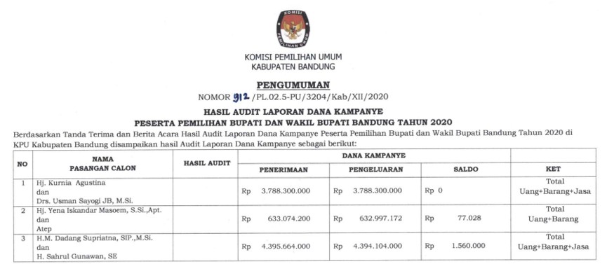 Pengumuman Hasil Audit Laporan Dana Kampanye Peserta Pemilihan Bupati dan Wakil Bupati Bandung Tahun 2020, selengkapnya dapat DIUNDUH DI SINI