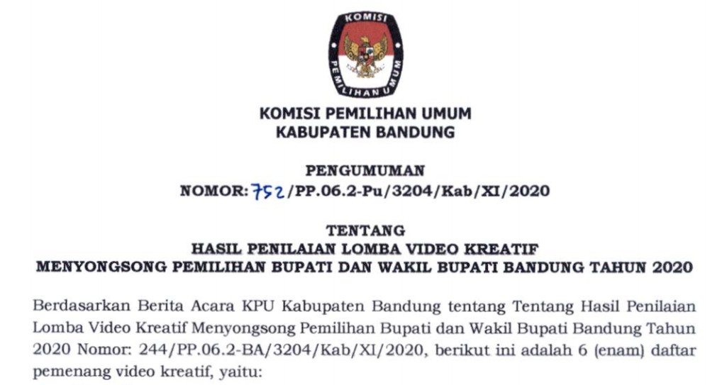 Pengumuman hasil penilaian lomba video kreatif menyongsong Pemilihan Bupati dan Wakil Bupati Bandung Tahun 2020, selengkapnya dapat DIUNDUH DI SINI.