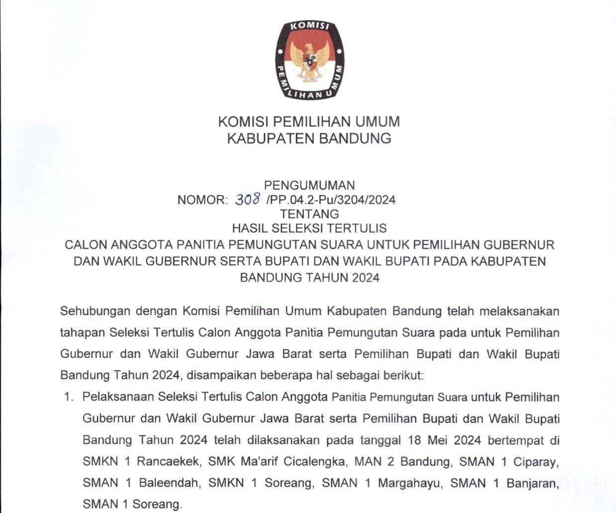 Sehubungan dengan Komisi Pemilihan Umum Kabupaten Bandung telah melaksanakan tahapan Seleksi Tertulis Calon Anggota Panitia Pemungutan Suara pada untuk Pemilihan Gubernur dan Wakil Gubernur Jawa Barat serta Pemilihan Bupati dan Wakil Bupati Bandung Tahun 2024. Hasil Seleksi Tertulis Calon Anggota Panitia Pemungutan Suara untuk Pemilihan Gubernur dan Wakil Gubernur Jawa Barat serta Pemilihan Bupati dan Wakil Bupati Bandung Tahun 2024 adalah 1.552 (Seribu Lima Ratus Lima Puluh Dua) orang yang dinyatakan Lulus dan 261 (Dua Ratus Enam Puluh Satu) orang yang dinyatakan Tidak Lulus, sebagaimana data terlampir.