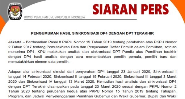 Pengumuman Hasil Sinkronisasi DP4 dengan DPT Terakhir untuk Penyelenggaraan Pemilihan Serentak Tahun 2020, selengkapnya dapat DIUNDUH DI SINI.