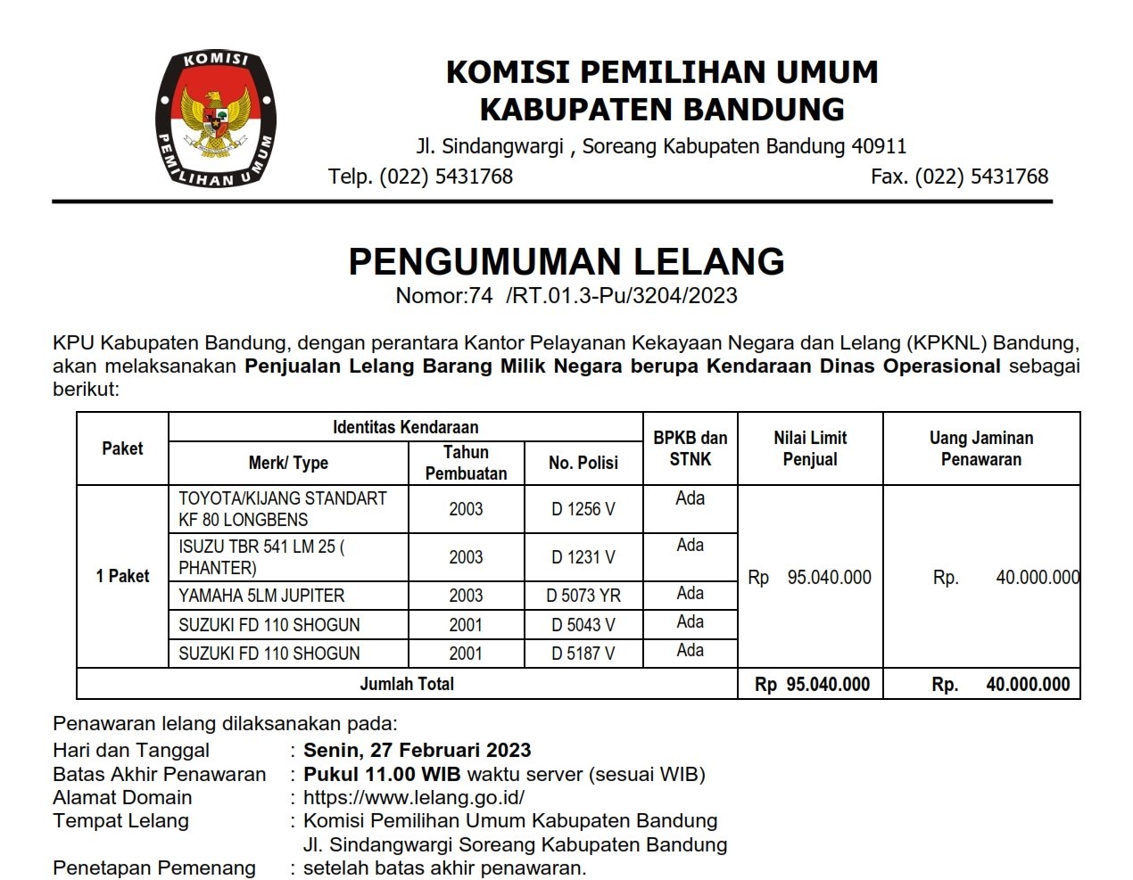 KPU Kabupaten Bandung dengan perantara kantor Pelayanan Kekayaan Neggara dan Lelang (KPKNL) Bandung akan melaksanakan Penjualan Barang Milik Negara berupa Kendaraan Dinas Operasional..Informasi selengkapnya DIUNDUH DISINI