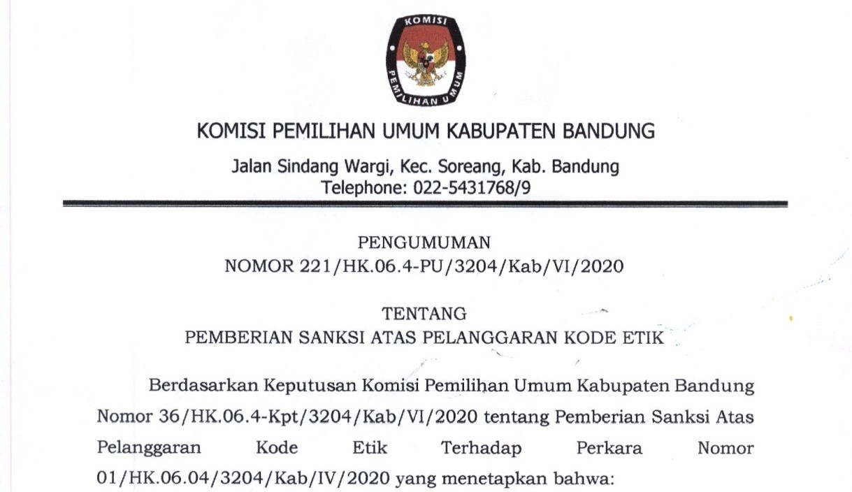 Pengumuman tentang Pemberitan Sanksi terhadap PPK Rancaekek atas Pelanggaran Kode Etik pada Pemilihan Bupati dan Wakil Bupati Bandung Tahun 2020, selengkapnya dapat DIUNDUH DI SINI