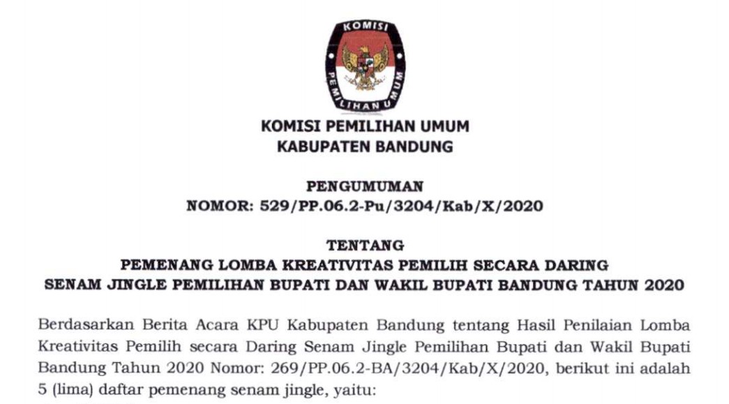 Pengumuman tentang pemenang lomba kreativitas pemilih secara daring senam jingle pada Pemilihan Bupati dan Wakil Bupati Bandung Tahun 2020, selengkapnya dapat DIUNDUH DI SINI.