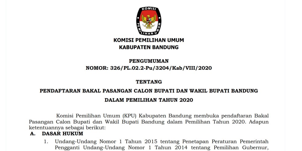 Formulir-formulir Pendaftaran Bakal Pasangan Calon Bupati dan Wakil Bupati Bandung dalam Pemilihan Tahun 2020, selengkapnya dapat DIUNDUH DI SINI