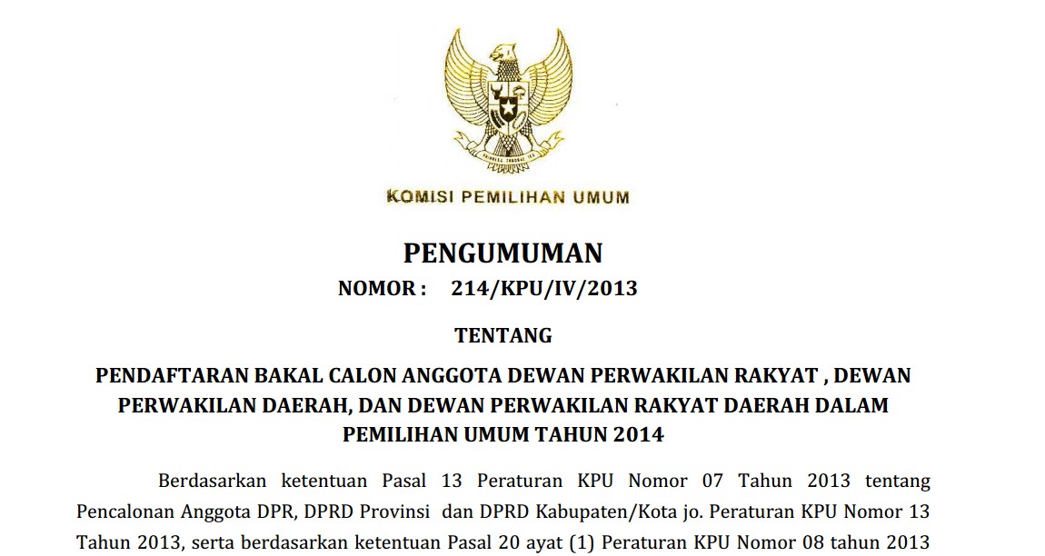 Pengumuman tentang pendaftaran bakal calon anggota DPR, DPD, dan DPRD dalam Pemilu Tahun 2014, selengkapnya dapat DIUNDUH DI SINI.